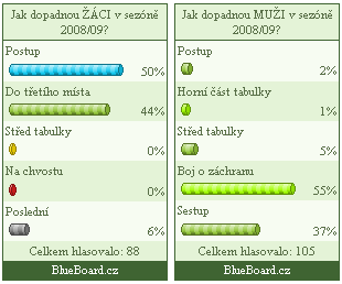 03.07.2009 07:35Všichni víme, jak minulá sezóna dopadla. Zde jsou výsledky anket, ve kterých jste vyjadřovali vaše tipy na umístění našich dvou družstev. Jak se výsledky shodují s realitou můžete posoudit sami;-)